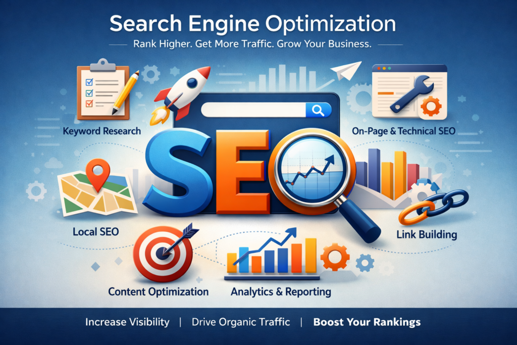 SEO (Search Engine Optimization) helps your business appear on Google and other search engines when people search for products or services related to your brand. The higher your website ranks, the more organic traffic, leads, and trust you gain—without paying for ads.